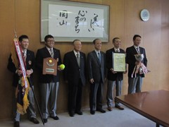 「第44回日本男子ソフトボールリーグ決勝トーナメント」で優勝した「平林金属男子ソフトボールクラブ」の選手・関係者が、大森雅夫岡山市長を表敬訪問しました。