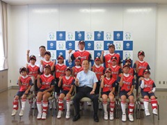 第29回全日本小学生男子・女子ソフトボール大会に出場する「岡山少年ソフトボールクラブ(男子)」「岡山リトルエンゼルス(女子)」の選手・関係者が岡山市役所を訪れ、大森雅夫岡山市長を表敬訪問しました。