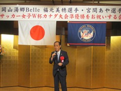 岡山湯郷Bell 福元美穂選手、宮間あや選手サッカー女子W杯カナダ大会準決勝をお祝いする会が行われ、大森雅夫岡山市長が出席しました。