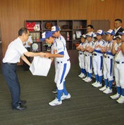 「高円宮賜杯第36回全日本学童軟式野球大会」に出場する岡山庭瀬シャークスの選手・関係者が、大森雅夫岡山市長を表敬訪問しました。
