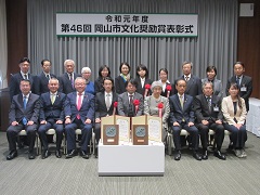 岡山市における文化の向上に中堅的存在として活躍している市民を表彰し、今後一層の研鑽を奨励するため、第46回岡山市文化奨励賞表彰式が開催され、大森雅夫岡山市長が出席しました。