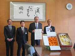 株式会社岡山丸果の花房昌男社長が市役所を訪れ、大森雅夫岡山市長にみかんとバナナ各100箱を寄贈しました。このみかんは「福祉みかん」と呼ばれ、市内の社会福祉施設に入所されている方々に配布されます。