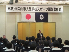 スポーツの各種競技や大会で特に優秀な成績を収めた個人・団体などに贈られる岡山市人見絹枝スポーツ顕彰の表彰式が行われ、大森雅夫岡山市長が今年度受賞された46人、8団体の皆さんを表彰しました。