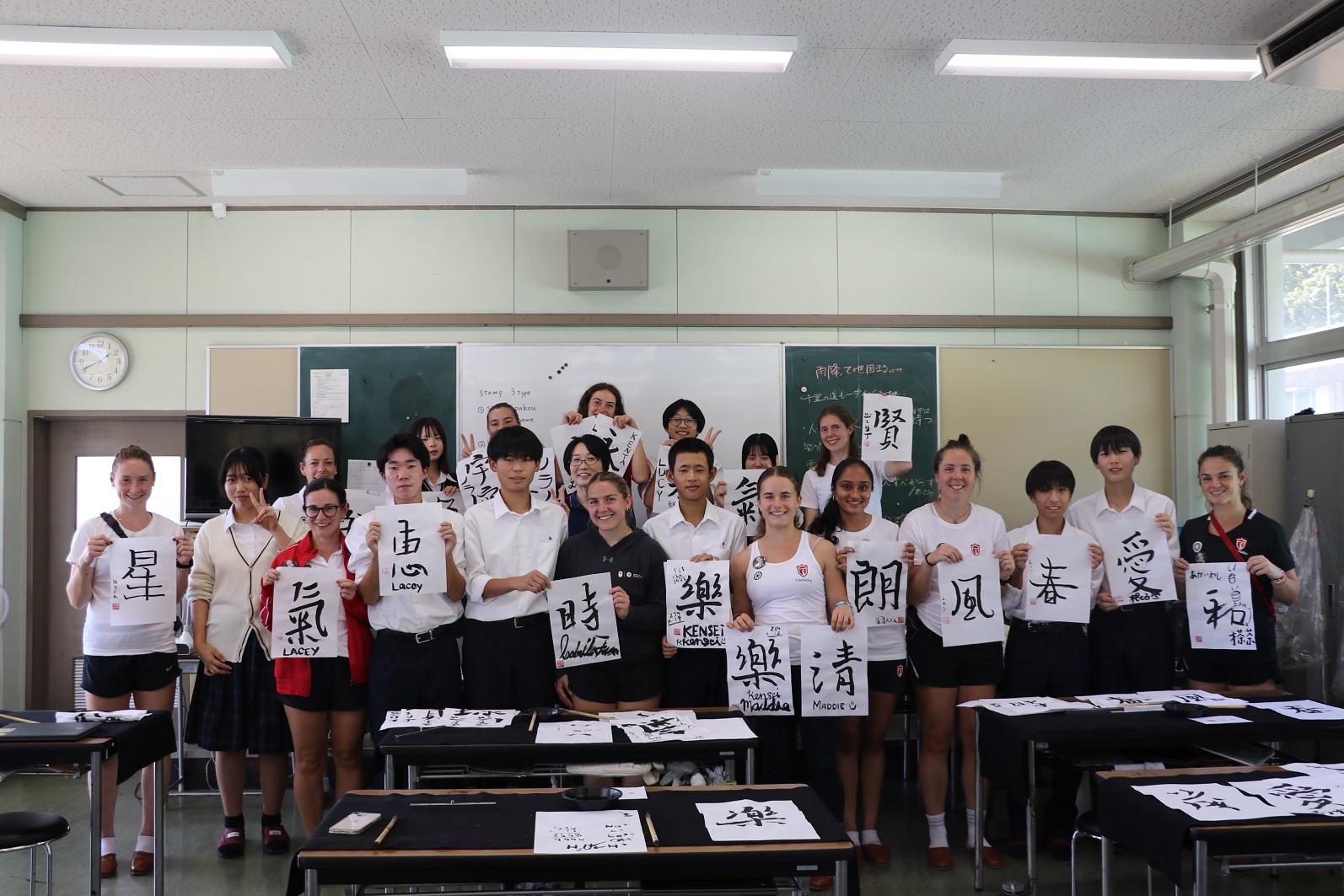 カナダチームは、トレーニングの後、瀬戸南高等学校において、書道と体育の授業に生徒と一緒に取り組みました。