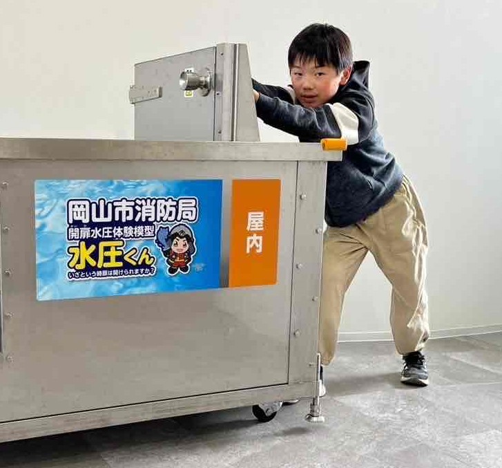 浸水時の扉にかかる水圧が体験できます。水深による扉の開放の難しさを体感します。