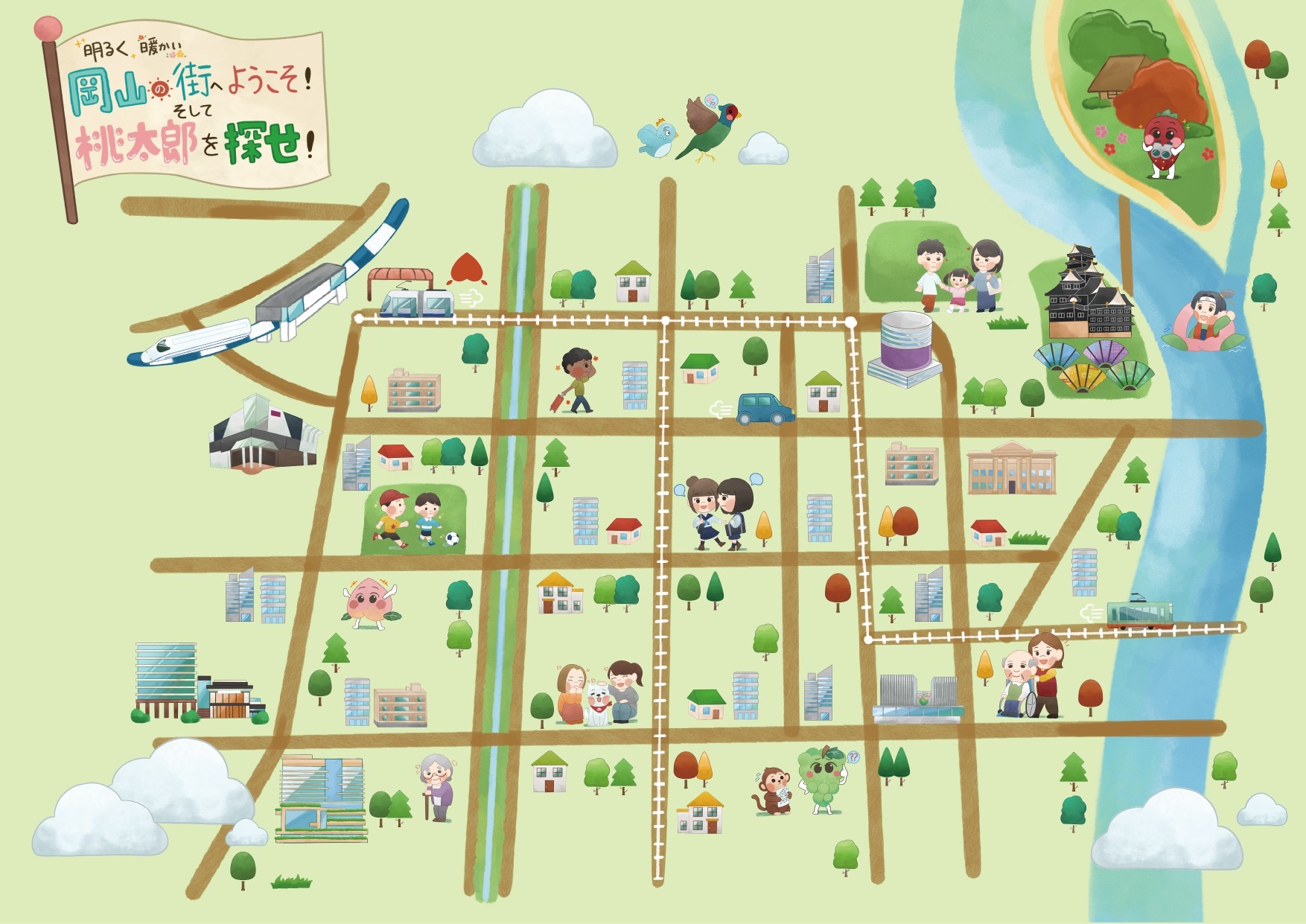 ”桃太郎一行”や”桃・イチゴ等の果物”のイラストがちりばめられており、4名それぞれの個性や岡山らしさがしっかりと表現された、素晴らしい作品を制作していただきました。