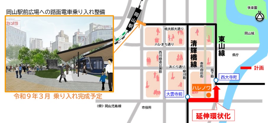 また、岡山駅前広場への路面電車乗り入れ整備事業と合わせて、路面電車の利便性を向上させることで駅前エリアに集中している賑わいを都心全体に広げます。