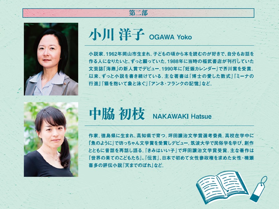 第一部でエディンバラの活動紹介、第二部で小説家・小川洋子さん、作家・中脇初枝さんの対談を行いました。司会は2月10日の事例発表にも参加してくれた山陽学園高校から、放送部の岡﨑友愛さん、柴田陽莉さんが担当。