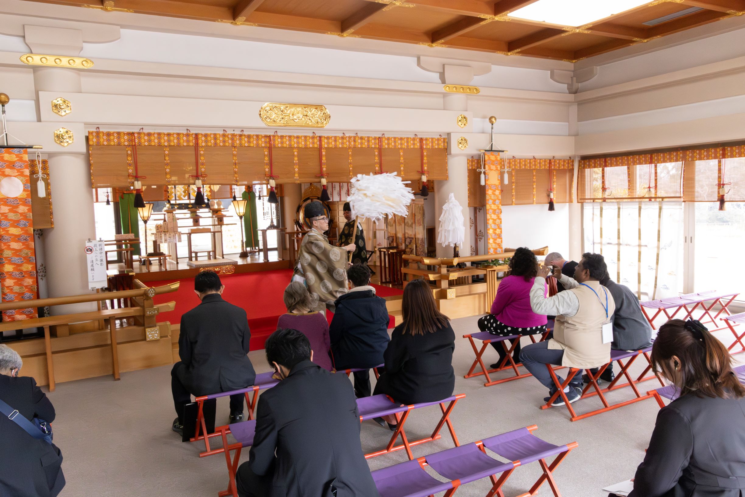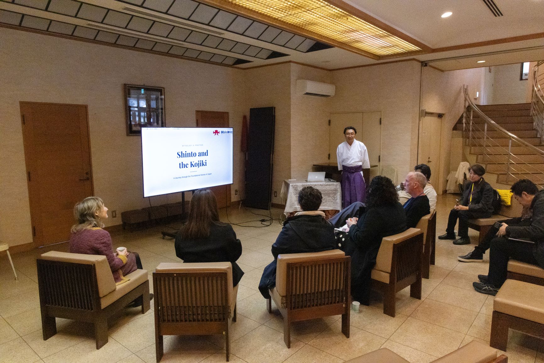 到着後、岡山神社の久山信太郎 宮司から、神道、神社、古事記等について、歴史・文化の切り口から説明があり、参加者は熱心に聞き入っていました。儀式や風習などに関する質問もあり、海外ゲストたちが日本文化についての理解を深めることができたのではないでしょうか。