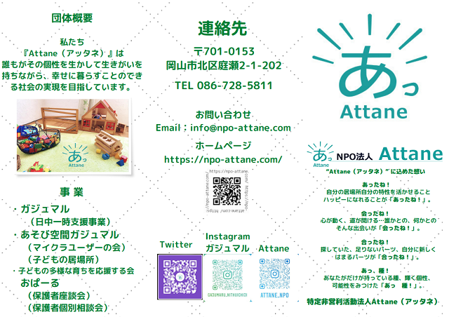 2020年8月 前特定非営利活動法人人・ふれあい・ひろばより事業承継を行い、新たに「特定非営利活動法人Attane(アッタネ)」となる。