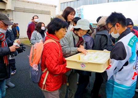 今回の市民イチバデーは、岡山県牛窓産白菜とキャベツのミルクスープの試食、マグロの解体ショー&即売会、タコのおでんの試食などのイベントを行い、寒い中、約8千人の来場者で賑わいました。