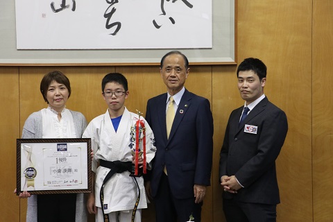 令和元年9月15日(日曜日)に大阪市で開催された「第38回全日本空手道選手権大会2019(アディダスカップ2019)」中学1年男子軽量級45kg未満で優勝した小倉康暉選手及び関係者が大森市長を表敬訪問しました。