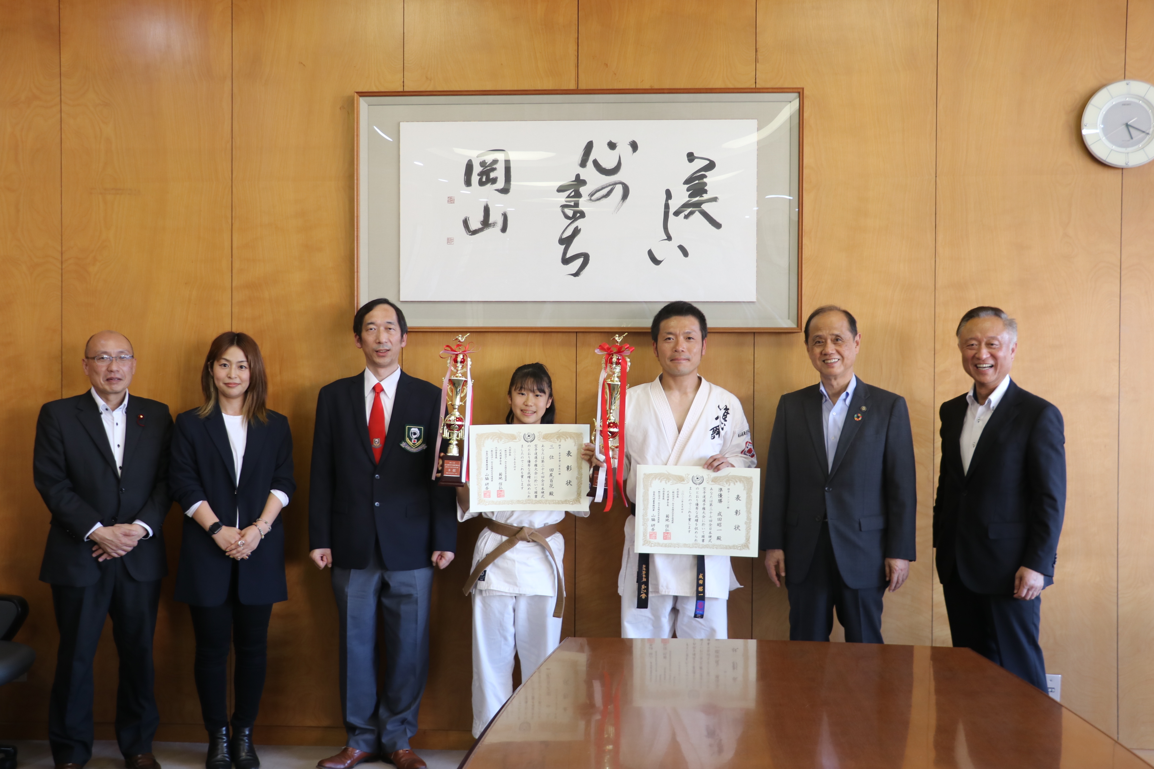 第37回全日本硬式空手道選手権大会で優秀な成績を収めた成田昭一(なりた しょういち)選手(唯心所属)、田尻百花(たじり ももか)選手(岡山市立岡北中学校2年生・唯心会所属)・関係者が大森市長を表敬訪問しました。