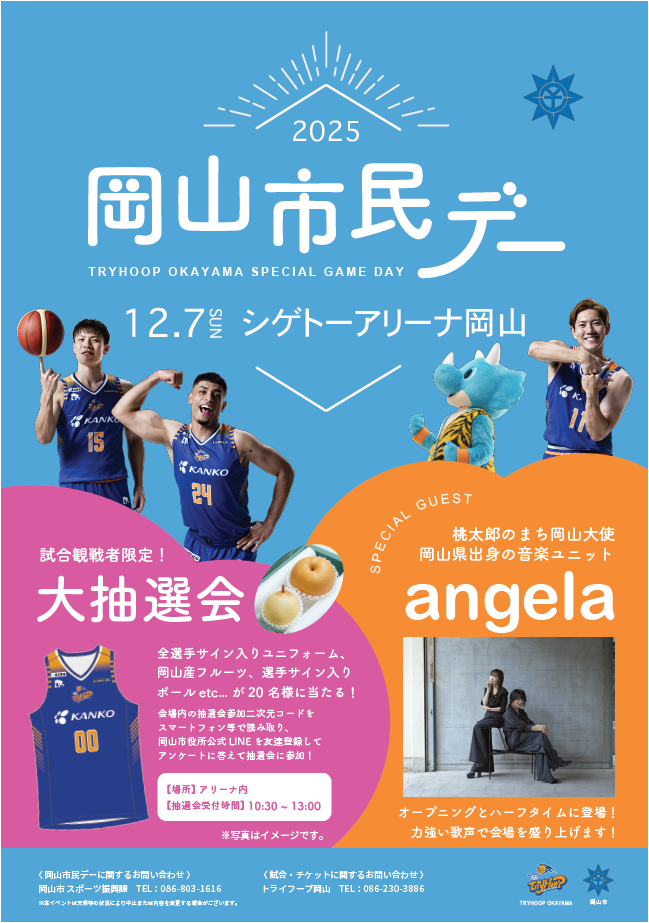 「桃太郎のまち岡山大使」である岡山市出身の2人組アニメソングユニットangela(アンジェラ)と岡山楷の木少年少女合唱団のパフォーマンスがトライフープ岡山のホームゲームを盛り上げます!