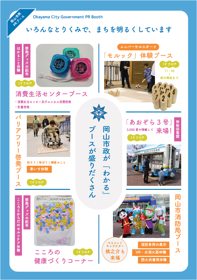 | 岡山市消防局ブース | 防火について学ぼう! ・消防車両展示、防火服着用体験など ・マスコットキャラクター桃之介もやって来る! |