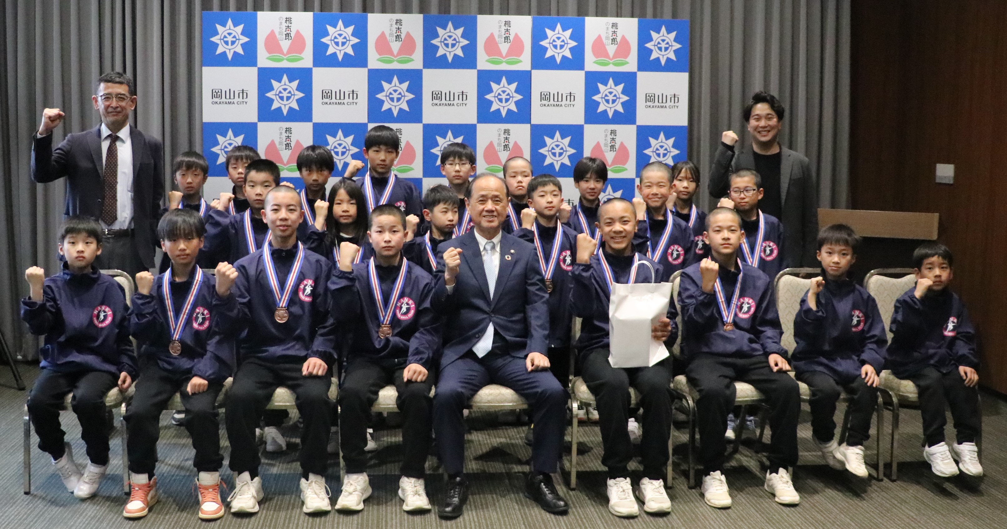 全国大会で3位となった「南輝ドッジボールクラブ」の選手・関係者が岡山市長を訪問しました。