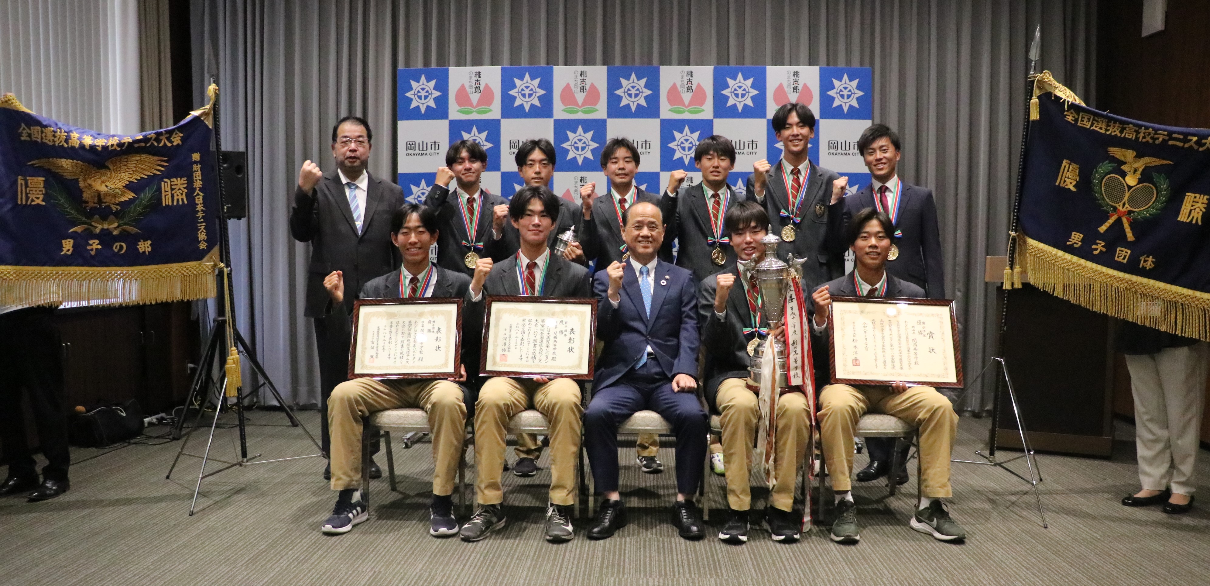 全国大会で優勝した関西高等学校テニス部の選手・関係者が岡山市長を訪問しました。