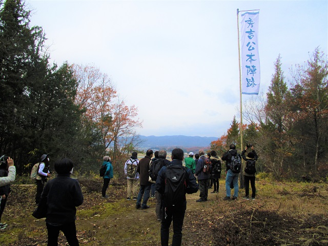 約20名の方にご参加いただき、備中高松城址公園をスタートとして、秀吉陣所跡、蛙ヶ鼻築堤跡、造山古墳、庚申山等を巡り、地元のボランティアガイドさんや岡山市文化財担当職員による説明を聞きながら、約7kmのウォーキングを楽しんでいただきました。