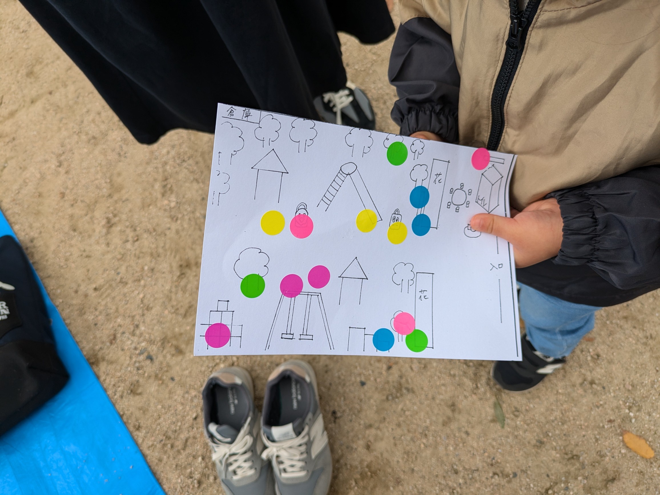 かわいい松ぼっくりをいろんなところに隠して、地図を持って宝さがしもしました。