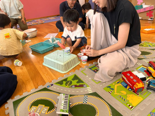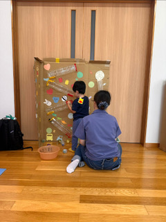 室内で金魚すくい遊び…のつもりで出していた金魚たちですが、子どもたちは遊びの天才!
