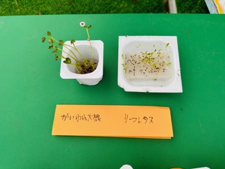 こちらはスタッフが1週間前にタネをまいた見本のかいわれ大根(と、試しにやってみたリーフレタス)