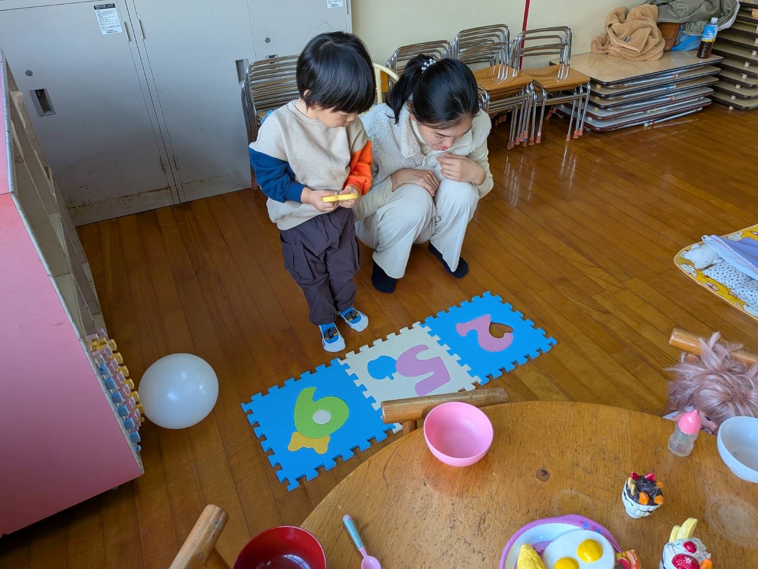製作が終わった後は、数字のマットやお人形で遊びます。