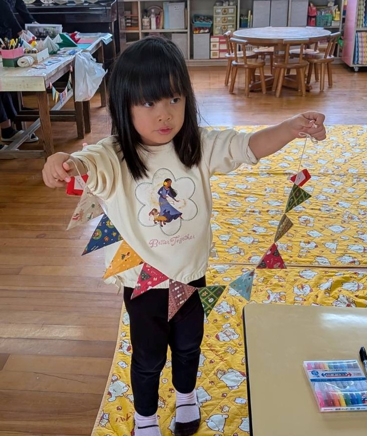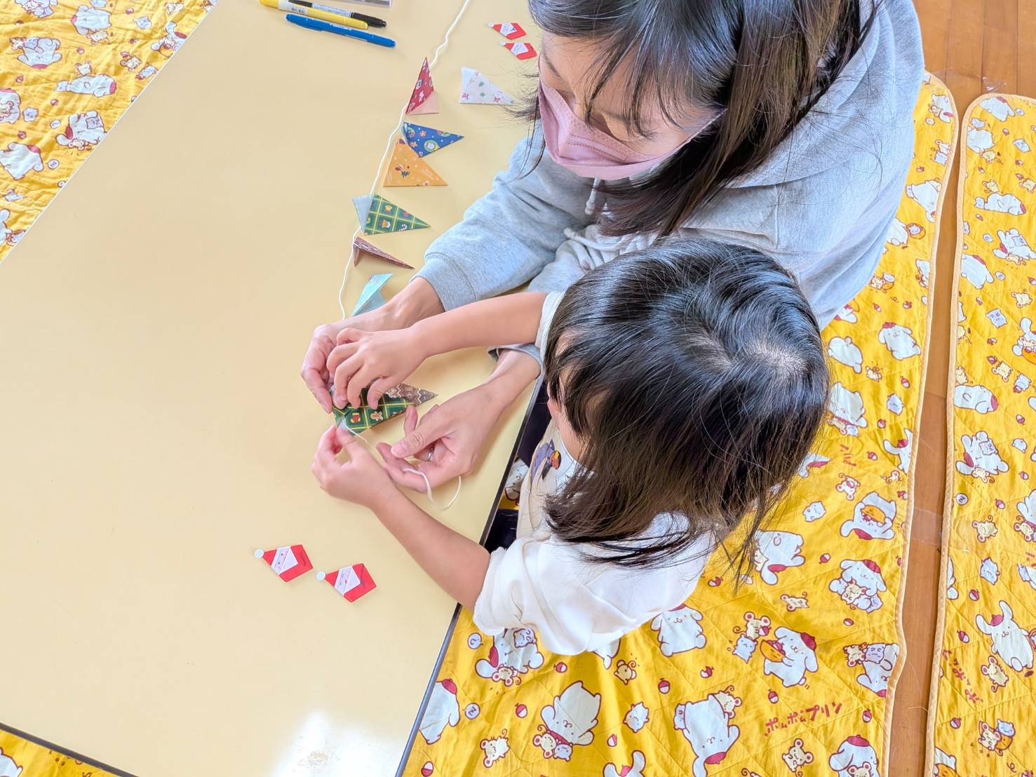 折り紙名人のスタッフが折って用意してくれた三角の折り紙を、タコ糸でつなげてタペストリーのようにしてみました。
