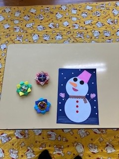 折り紙で作ったコマを回してみたり、雪だるまのふくわらいやスタッフが持参した昔ながらの羽子板で羽根つきをしてみたり、見て・触って・親子で一緒に楽しんでもらいました。