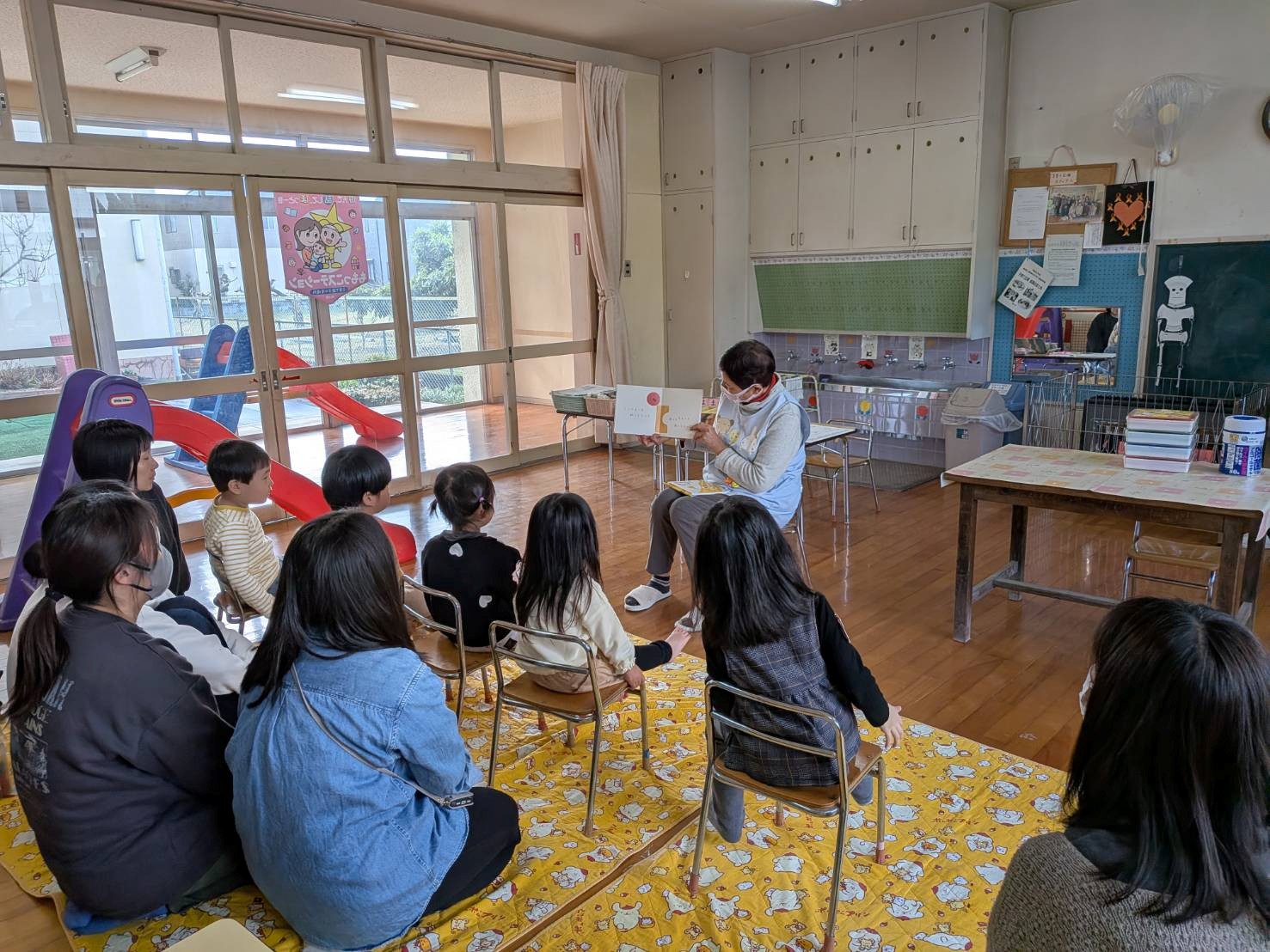 絵本の時間になると、一人ひとりがイスを持ち絵本を構えたスタッフの前に座る姿に、子どもたちの成長を感じる瞬間でした。