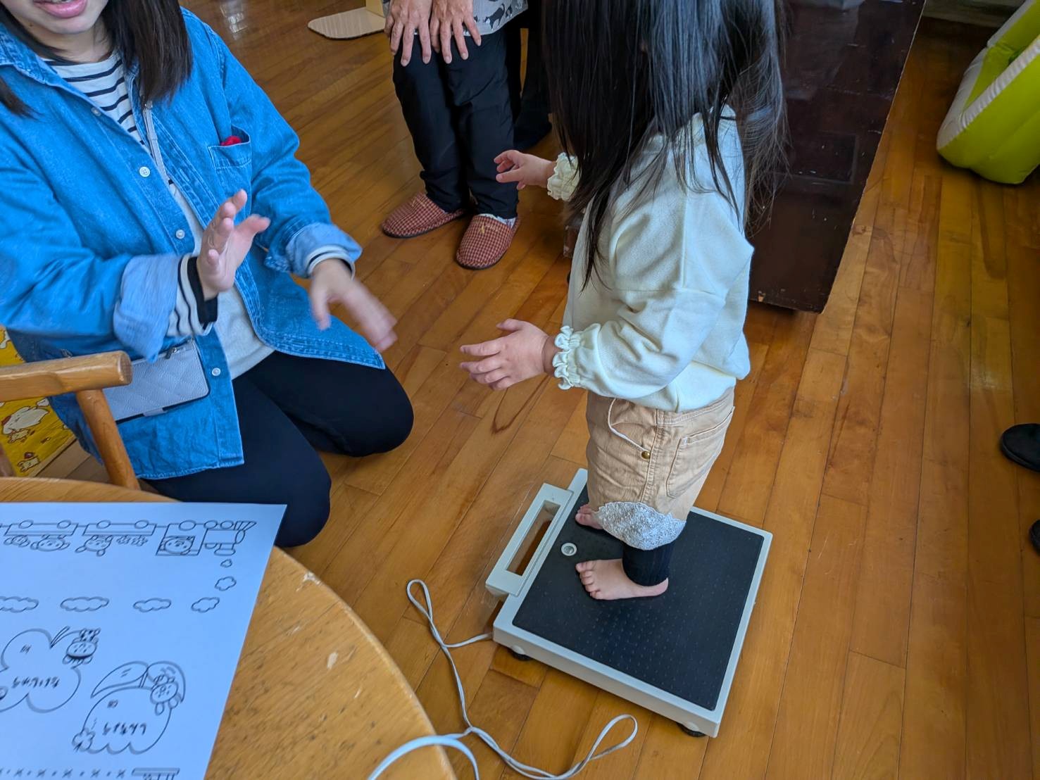 今日は、幼稚園から身長計と体重計を貸して頂いて、一人一人測りました。