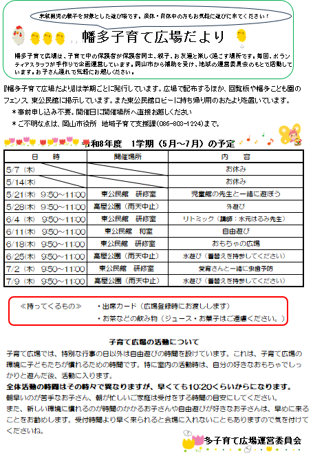令和8年度幡多子育て広場1学期の予定【幡多子育て広場】