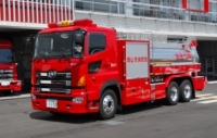 後方の水槽に、水を10トン積載可能です。高速道路、バイパス高架上など水利のない場所や、大量の水が必要な場合に出動します。