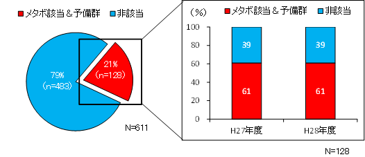 平成26年度健診結果でメタボ該当・メタボ予備軍であった者のうち、39%が平成27年度健診結果においてメタボ非該当に改善し、平成28年度も同数が非該当を維持されています。