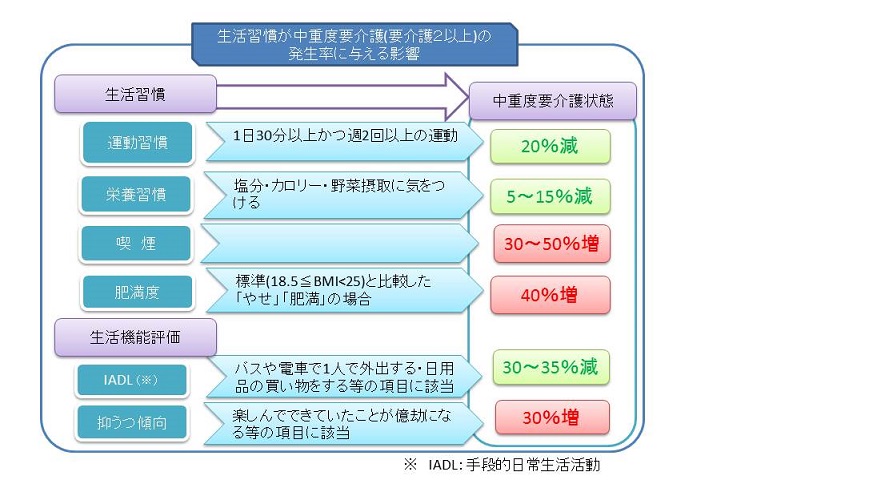 生活習慣、生活機能評価について中重度要介護(要介護2以上)の発生率に与える影響を検討結果