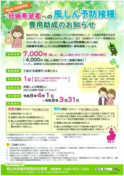 岡山市では、先天性風しん症候群(CRS)の予防を目的として、妊娠を希望する女性とそのパートナー(妊婦のパートナーを含む)を対象に、麻しん・風しん混合ワクチン等の接種費用の一部を助成しています。