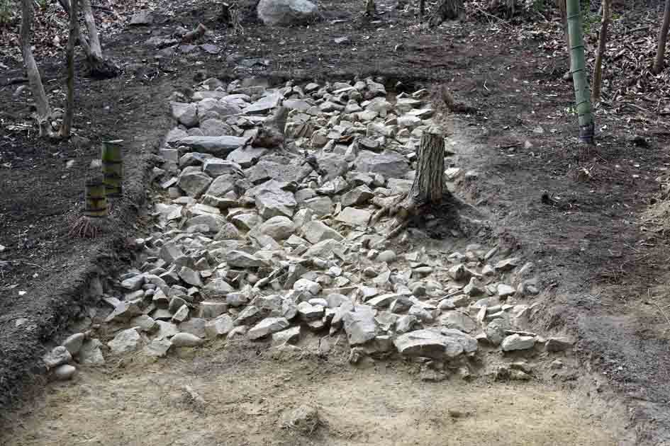 墳丘にともなう遺構の状況を確認するため、後円部の内部北側の、一段目・二段目平坦面の発掘調査を行っています。