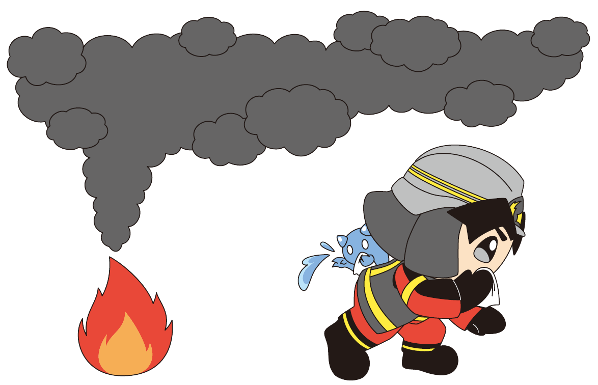 火災予防戦隊まもるんじゃーレッドと悪者の足元が、点灯しています。劇場や映画館等から避難する場合は、客席誘導灯に従って避難します。
