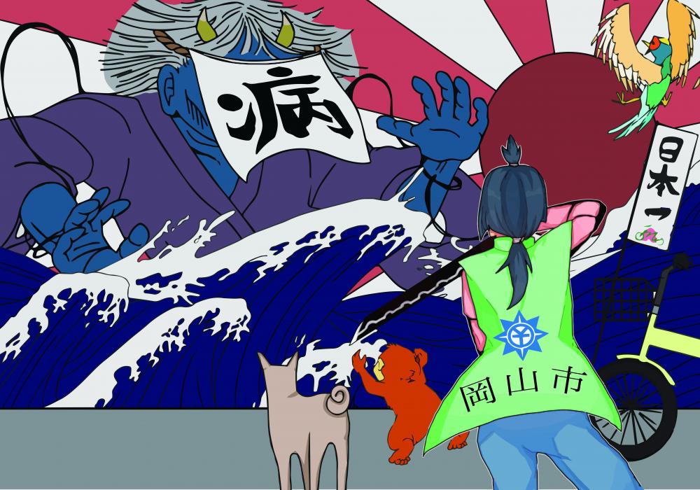 岡山市はSDGs3の「すべての人に健康と福祉を」に力を入れています。そこで私たちは岡山市の象徴でもある桃太郎が鬼である病魔を倒している姿を描き、岡山市が健康で元気なまちづくりに向けて取り組んでいる様子を表現しました。また、岡山市の「ももちゃり」も取り入れることで、住みやすいまちづくりのアピールも行っています。