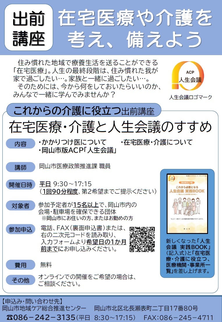 平成25年度から、岡山市における在宅医療・介護の普及啓発のため、市職員が地域の公民館や集会所、企業等に出向いて講座を開催しています。