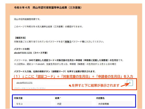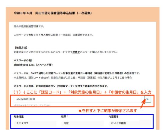 - 画面の(1)にパスワード(2.で控えた「認証コード」+「対象児童の生月日4桁」+「申請者の生月日4桁」)を入力してください。