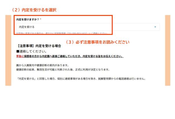 - 画面の(2)で「内定を受ける」を選択してください。