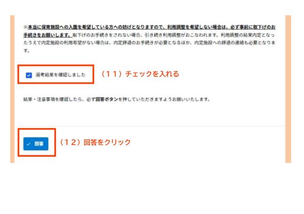 - 画面の(11)にチェックを入れて、画面の(12)の回答をクリックして確認は終了になります。