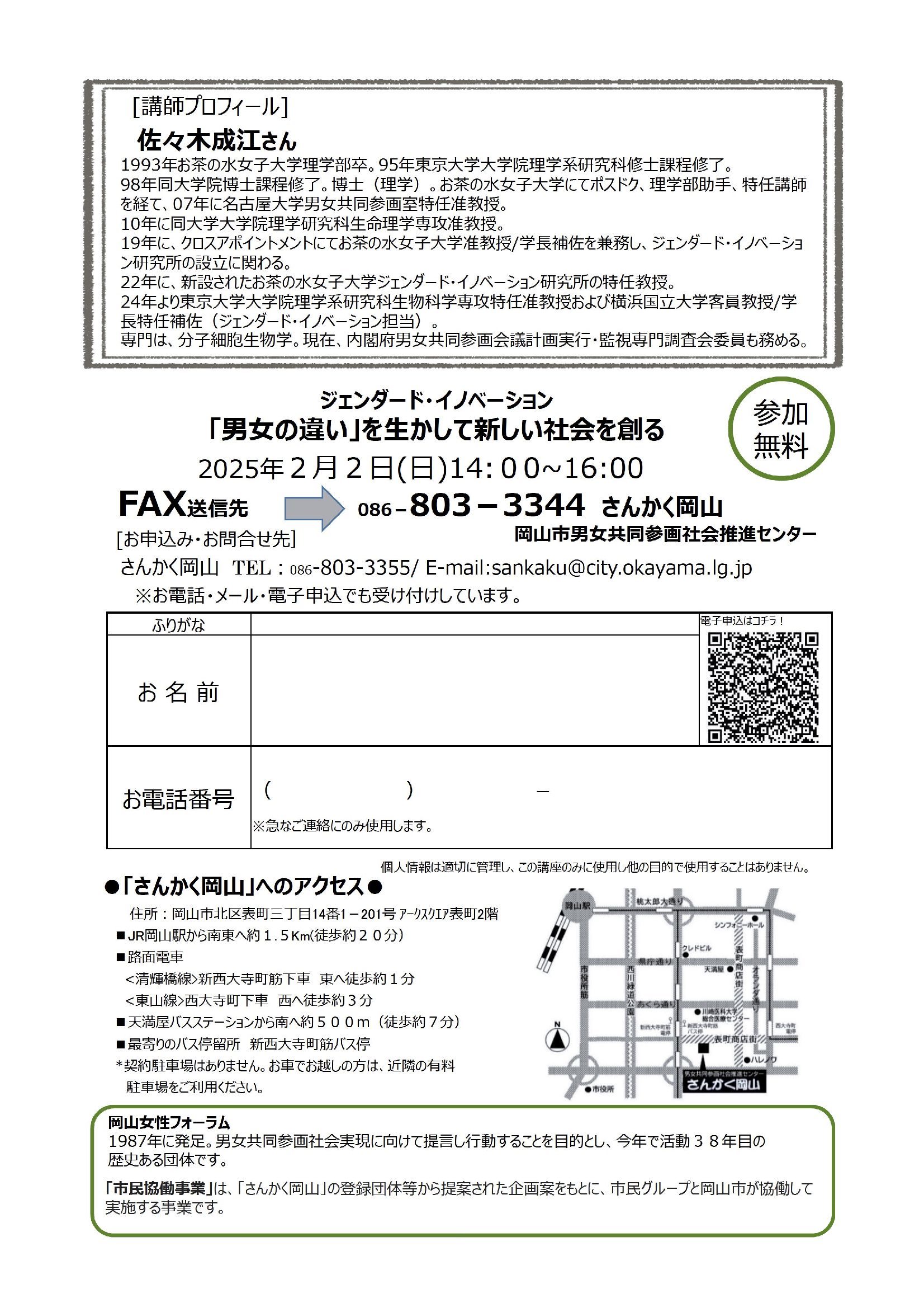 令和6年6月9日開催予定の『「男女の違い」を生かしてみんなに優しい社会を創る』を『「男女の違い」を生かして新しい社会を創る』とタイトルを一部変更して令和7年2月2日開催することといたしました。