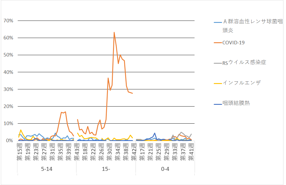 15歳以上の急性呼吸器感染症報告数は、第42週が123件で、第41週が157件から34件減少しました。