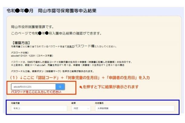 - 画面の(1)にパスワード(2.で控えた「認証コード」+「対象児童の生月日4桁」+「申請者の生月日4桁」)を入力してください。