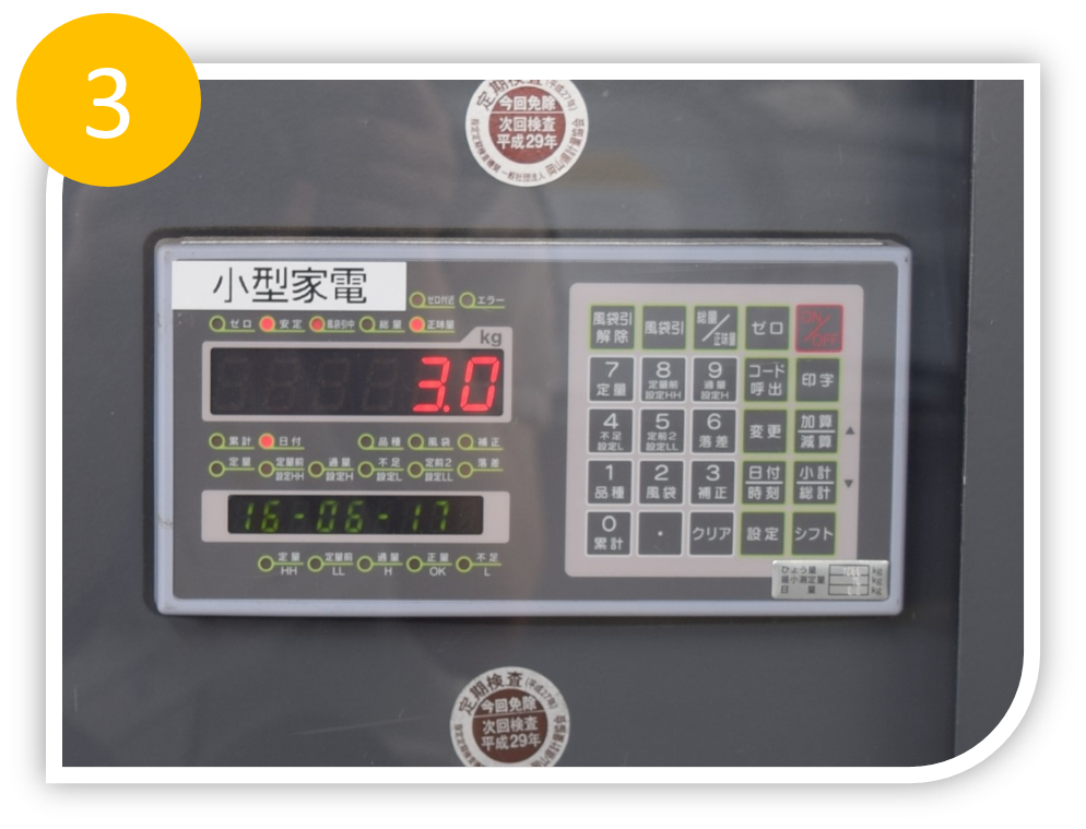 ボックスに入れると、自動で重量が表示されるんだ。掃除機は3.0キログラムだったよ。重量に応じて、カードにポイントが貯まるのがうれしいね。