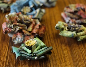 参加者たちは新聞紙の切り抜きの中から、自分の好きな色や模様を選んでいきました。この日は、普段からそらの活動に参加している中西さんがボランティア先生として、皆にブローチの作り方を教えました。