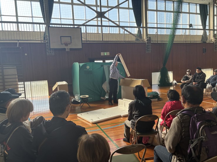 岡山市危機管理室のブースでは、発泡スチロールベッドや簡易トイレについて説明が行われ、避難所での生活を具体的にイメージできる内容となっていました。また、地元消防団のブースでは、物干し竿と毛布を使った簡易担架の作り方が紹介され、身近な物で対応する工夫が伝えられていました。