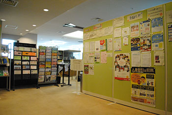 場所は、西川緑道公園沿いにある、西川アイプラザの4階。エレベーターを降りると、さまざまなイベント等のチラシが貼られた大きな掲示板が出迎えます。友好交流サロン発行の多言語情報紙「あくら」だけでなく、外国語の新聞や雑誌、書籍、辞書なども置かれ、自由に閲覧できるスペースとなっています。