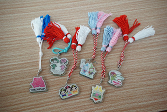 最後に房の端をきれいに切りそろえて、提げ紐に岡山市のイメージキャラクター「ミコロ・ハコロ」のキーホルダーを結べば完成。最後は自作のマルテニツァを手に、全員で記念撮影を行いました。一緒に参加した先生や生徒からは、「楽しみながら心を込めて作ったので、ブルガリアの地に届く日が楽しみです」と感想が挙がりました。